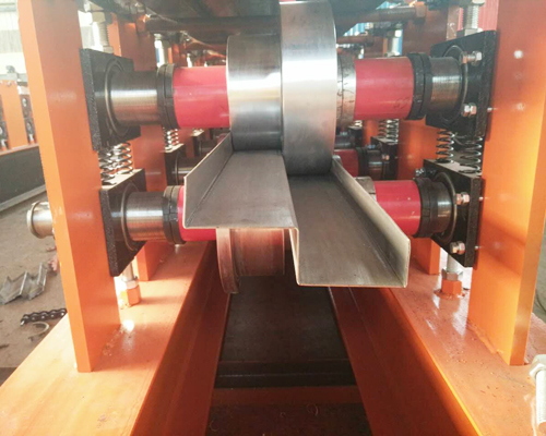 主機進料口處設置左右導向裝置。工作時,原材料板材兩側經左右導向進入主機,使原材料板材與輥壓成型系統保持正確的位置。可通過手動螺桿機構調節導向位置,且左右獨立可調。